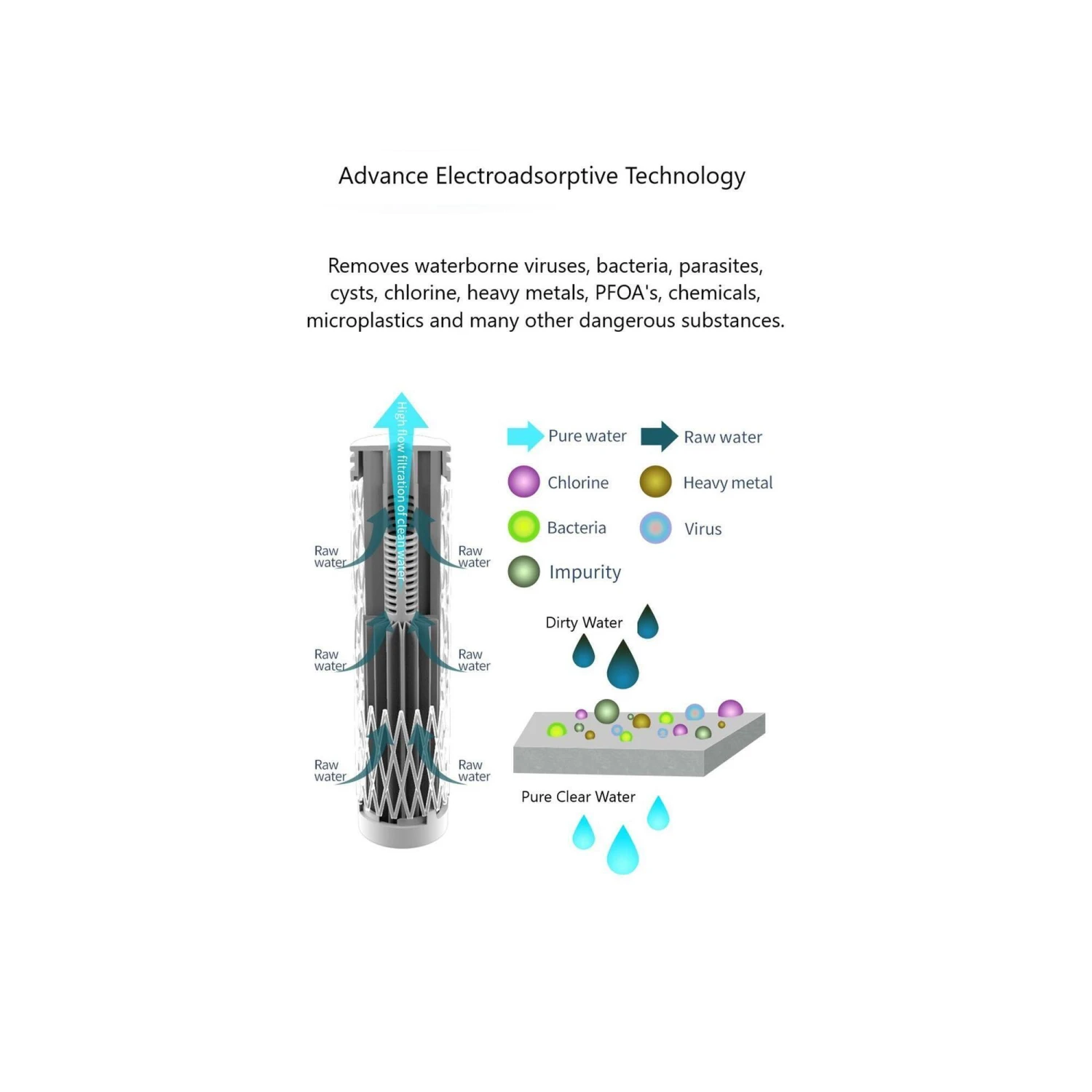 Removes Water Borne Viruses, Bacteria, Parasite, Chemicals, PFOA’s, Trace pharmaceutical, Heavy Metals, Turbidity, Chlorine and much more