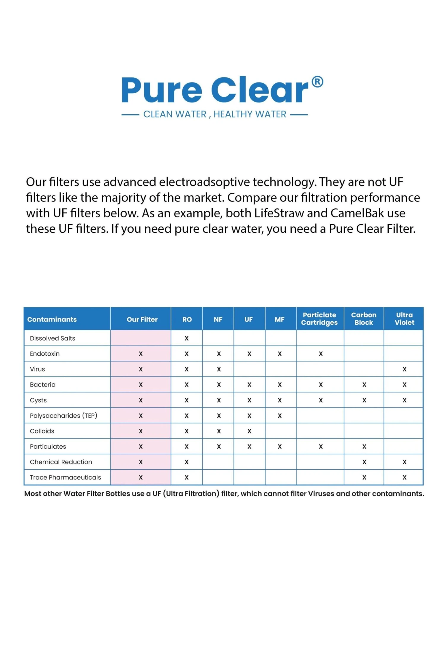 The Pure Clear® Collapsible Squeeze Water Filter Bottle protects against waterborne viruses, bacteria, parasites, endotoxins, microplastics, chlorine, trace pharmaceuticals, chemical reductions (PFOA’s), organic and chemical matter, dirt, sand, cloudiness and improves taste. Our filters have a 3 stage filtration process and uses advanced electroadsorptive technology. We do not have a mechanical filter (prone to blockage) plus an additional carbon filter, where both require replacement after a period of usage. The advanced filter is not a UF (Ultra Filtration) Filter, it is not hollow, therefor this helps prevent bacteria growth inside the filter. Please see our image table for a comparison. NOTE: – This product protects against Waterborne Viruses unlike the majority of other products available, remember that waterborne pathogens does not necessarily mean waterborne Viruses.