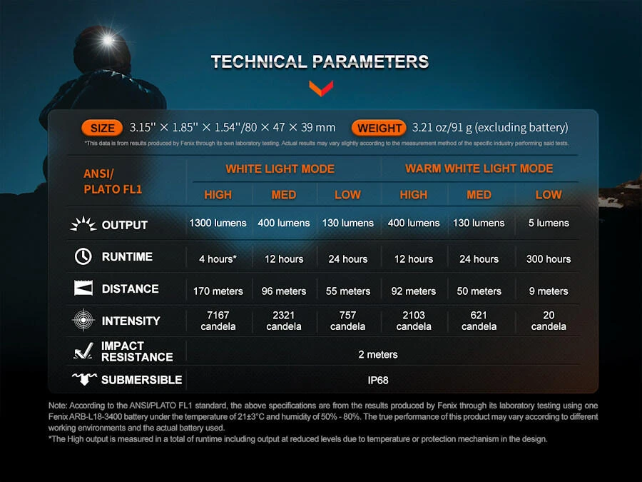 • High 1300 lumens (4 hrs total inc temperature and battery level step downs) – 170m beam